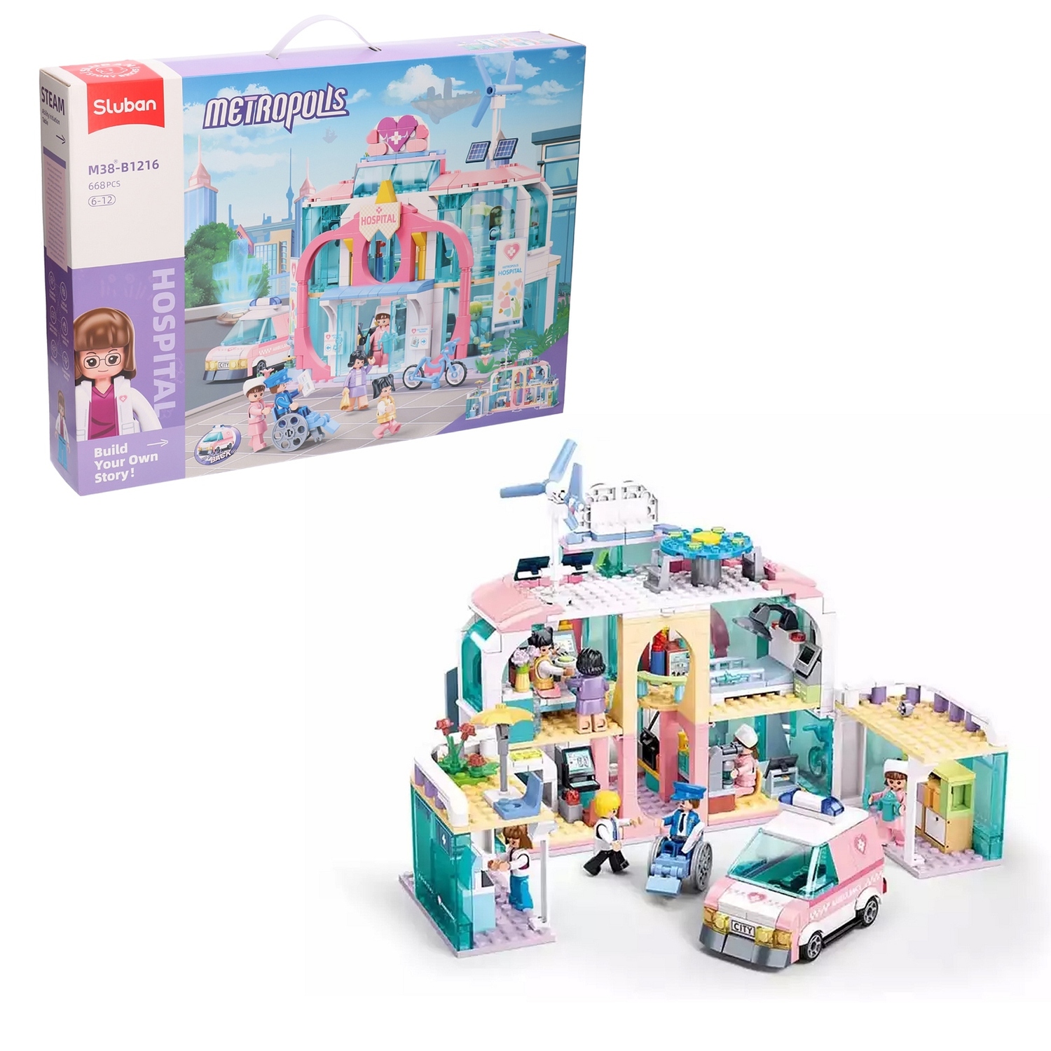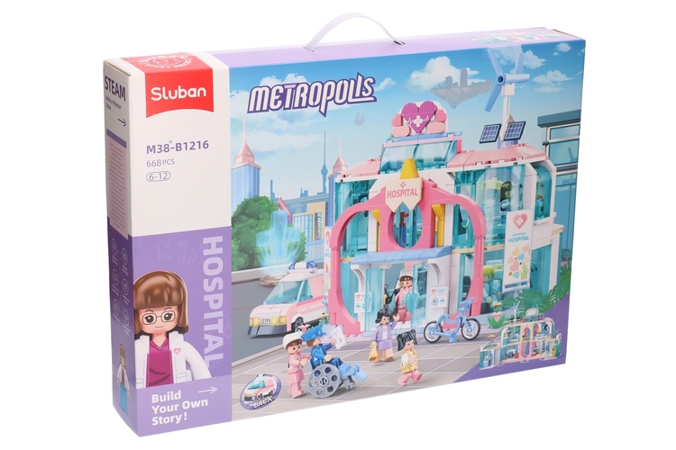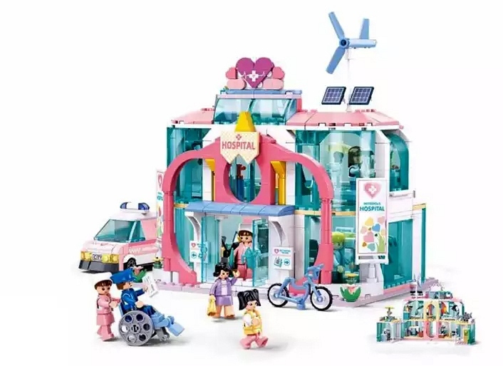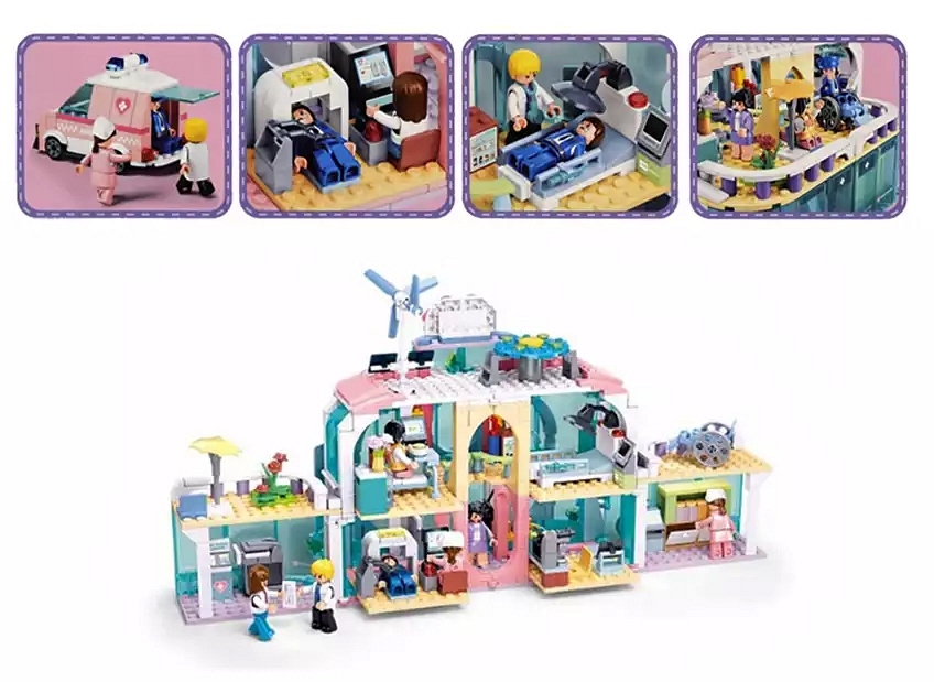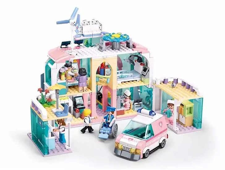 Ten, otwerany dla wygodniejszej zabawy, kilkupiętrowy budynek ma wiele pomieszczeń, w których lekarze i pielęgniarki realizują swoje zadania.