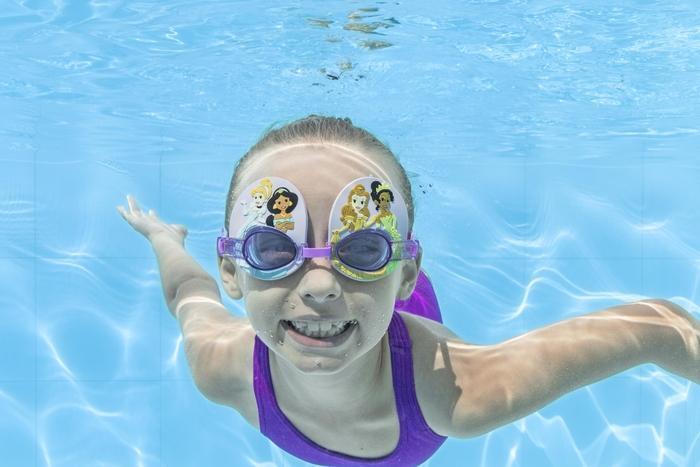 Okularki do pływania Disney Princess mają kolorowe, odporne na uderzenia soczewki poliwęglanowe z powłoką chroniącą przed promieniowaniem UV, które chronią oczy dzieci przed słońcem, a jednocześnie sprawdzają się podczas żywiołowej zabawy w basenie.
