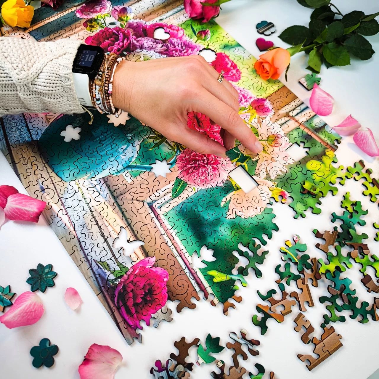 Żywa kolorystyka: Bogactwo różu, czerwieni, zieleni i błękitu tchnie życie w każdy kawałek układanki, tworząc wrażenie prawdziwego bukietu pełnego energii i piękna.
