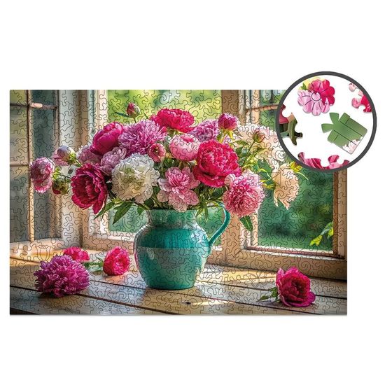 Ta wyjątkowa układanka zawiera 500 elementów o nieregularnych kształtach, które tworzą olśniewający obraz wazonu pełnego barwnych kwiatów na tle rozświetlonego okna.