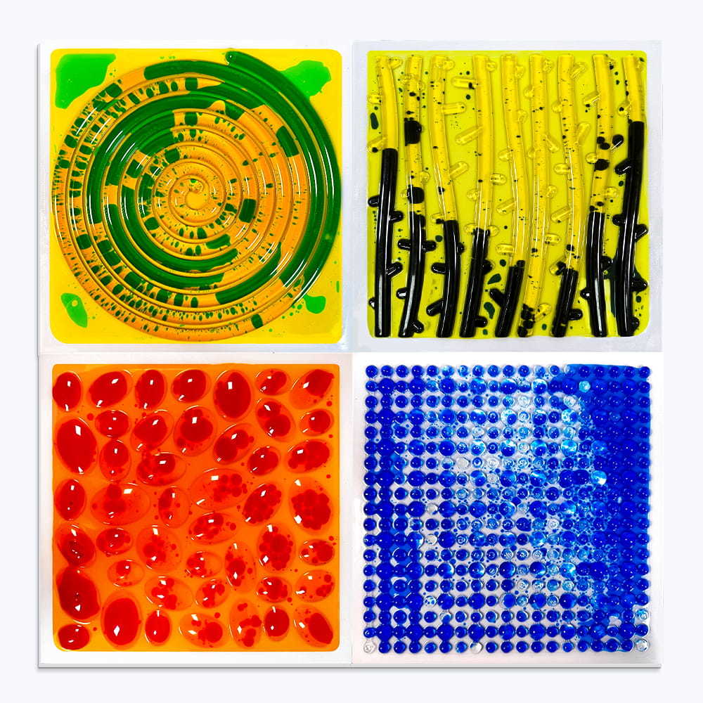 Każda płytka wypełniona jest bezpieczną, barwną cieczą, która przemieszcza się pod naciskiem stóp lub dłoni, tworząc zmieniające się wzory i dostarczając silnych wrażeń wizualnych.