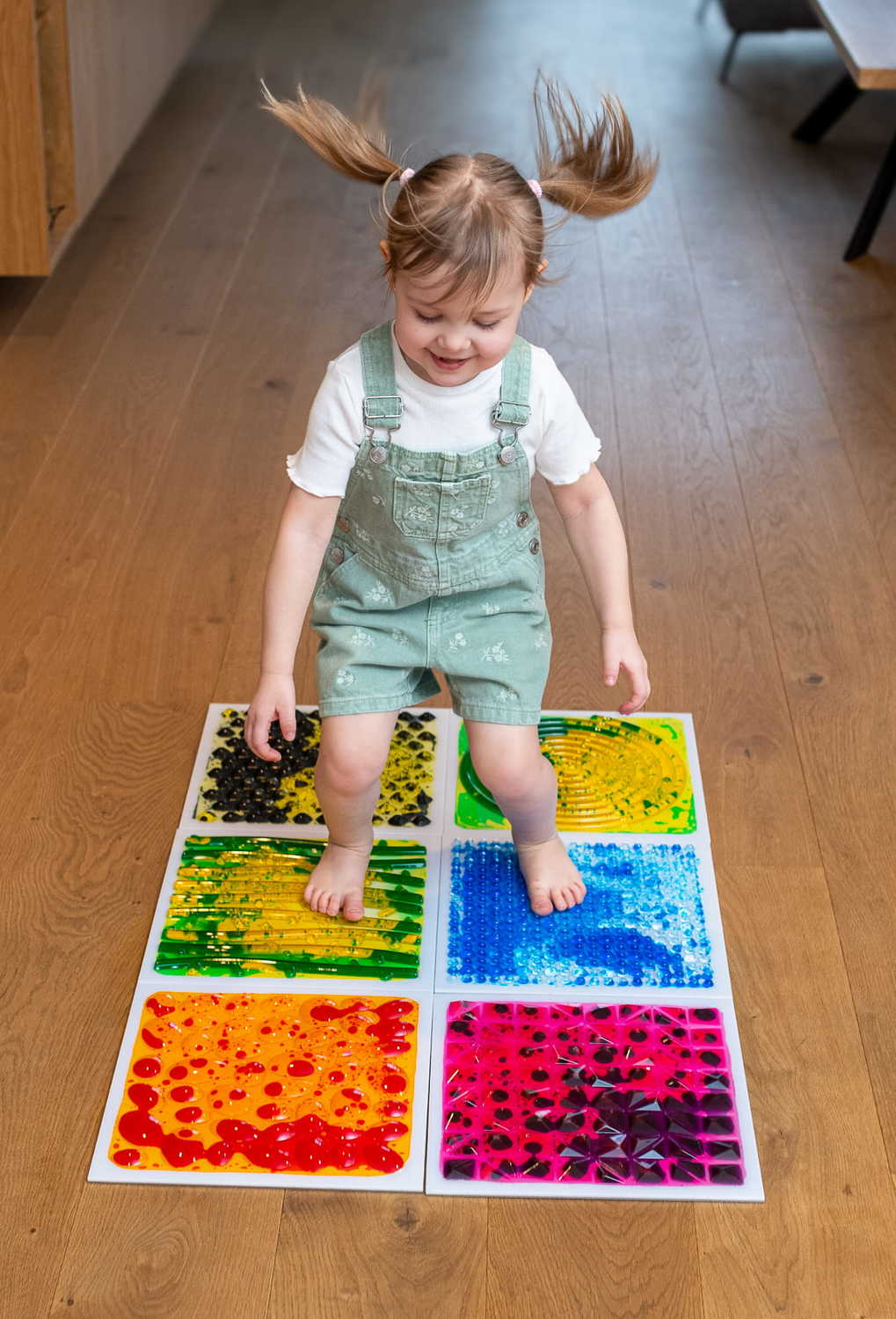 Kolorowe, fakturowe płytki sensoryczne z cieczą to innowacyjne narzędzie wspierające rozwój dziecka poprzez zabawę i stymulację zmysłów.