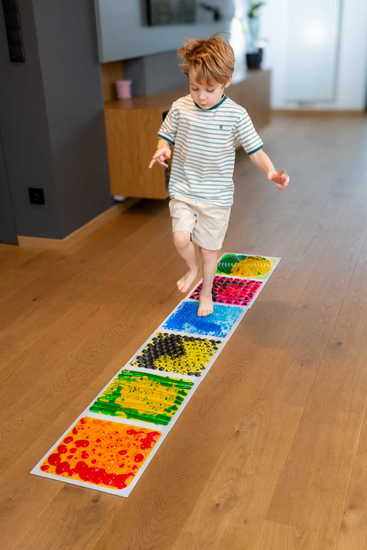 Płytki sensoryczne doskonale wspierają rozwój motoryki dużej i małej, poprawiają koordynację ruchową, równowagę oraz koncentrację.
