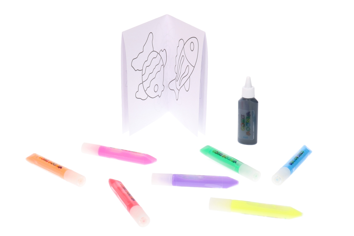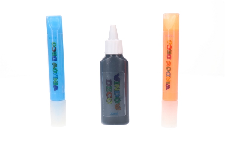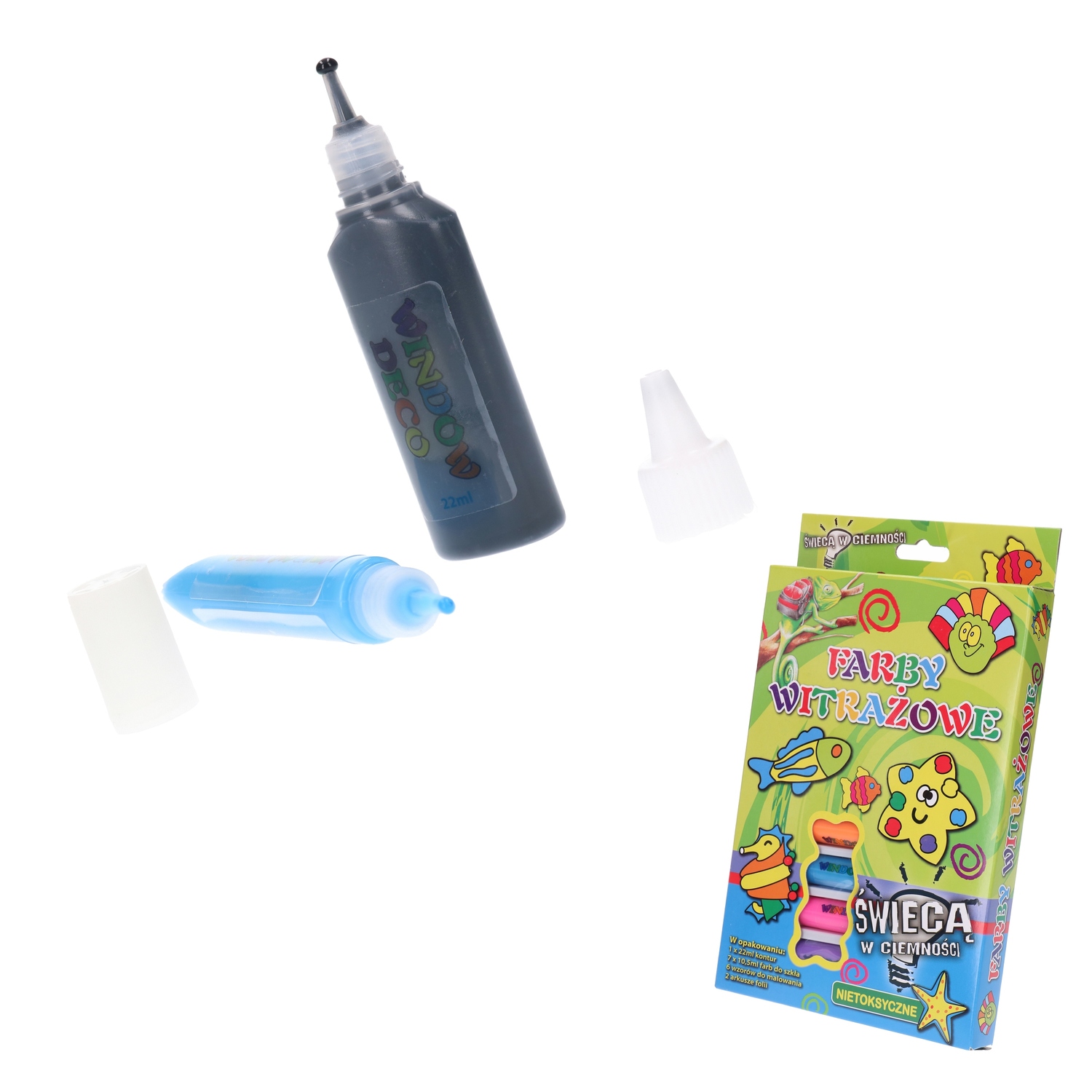 W zestawie: 2 arkusze folii, 6 wzorów do malowania, 7 10,5 mililitrowych farb do szkła i 22 mililitrowa farba konturowa.