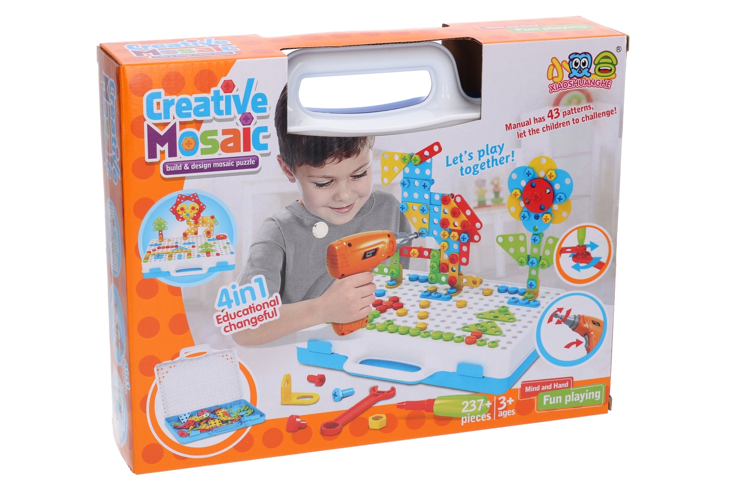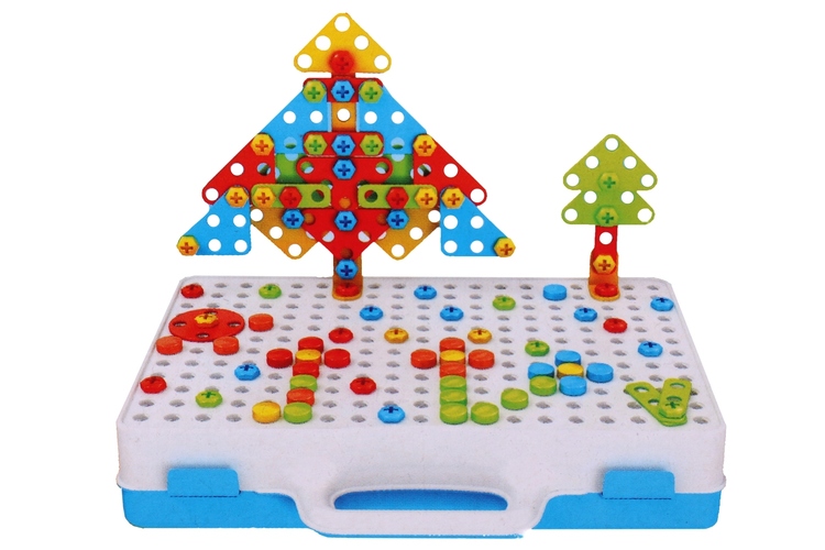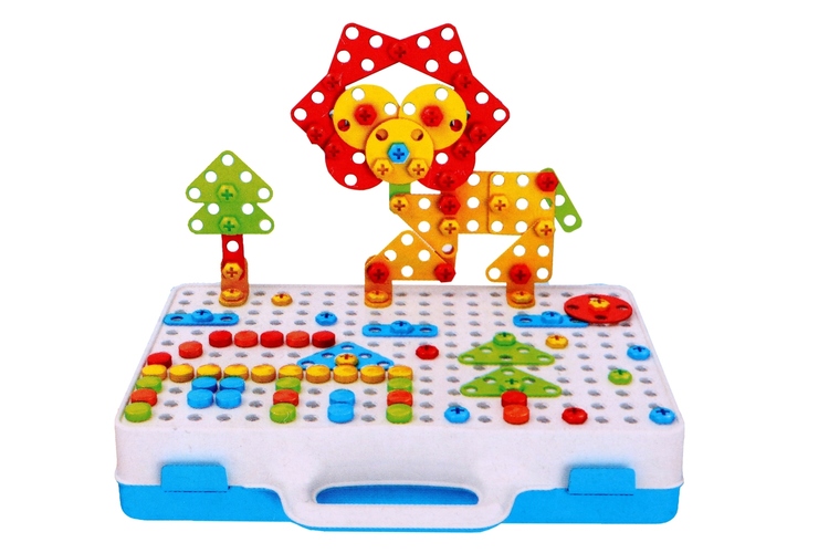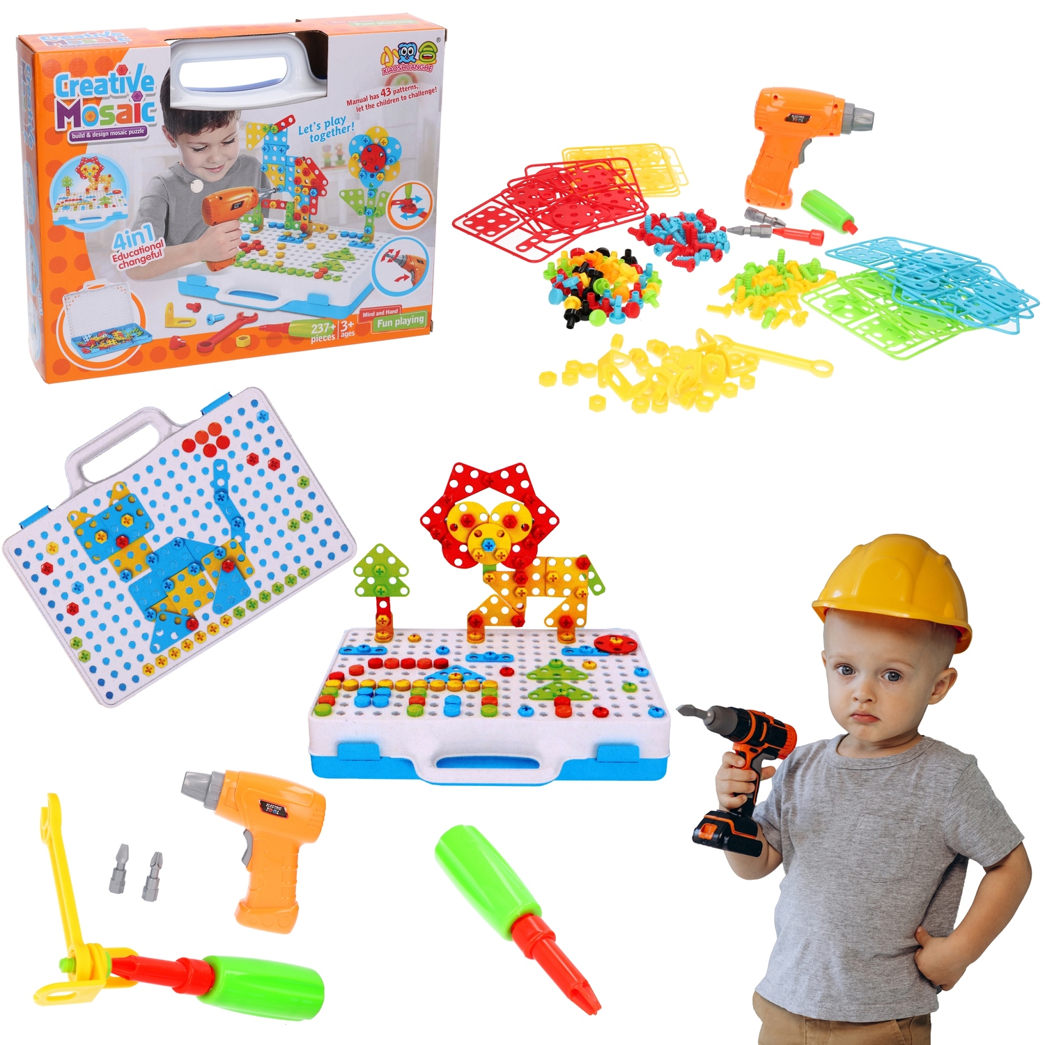 Pozwól mu budować, projektować i tworzyć własne, unikalne mozaiki, korzystając z 237 elementów i funkcjonalnej wkrętarki.