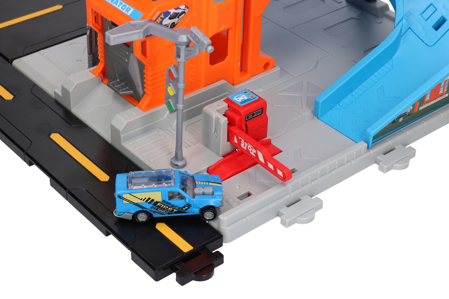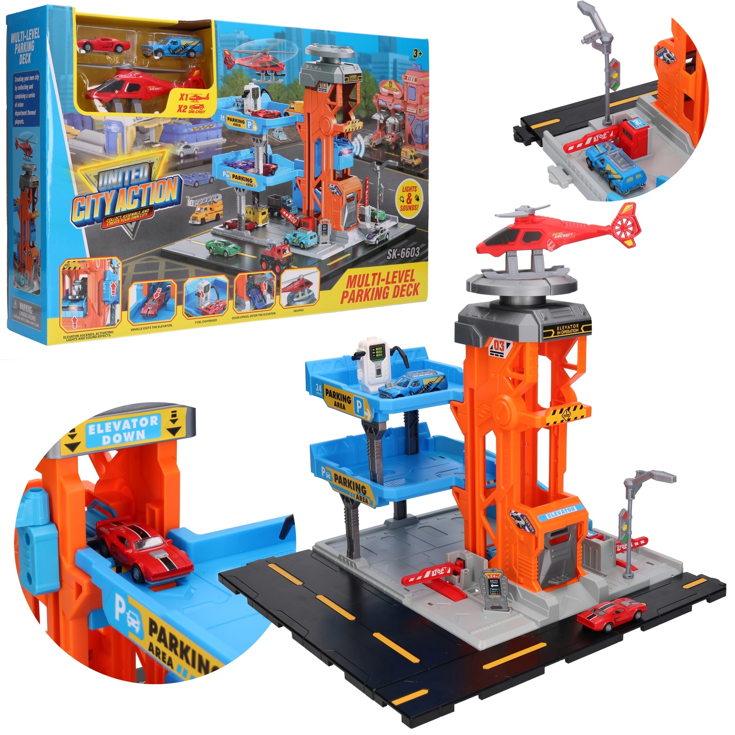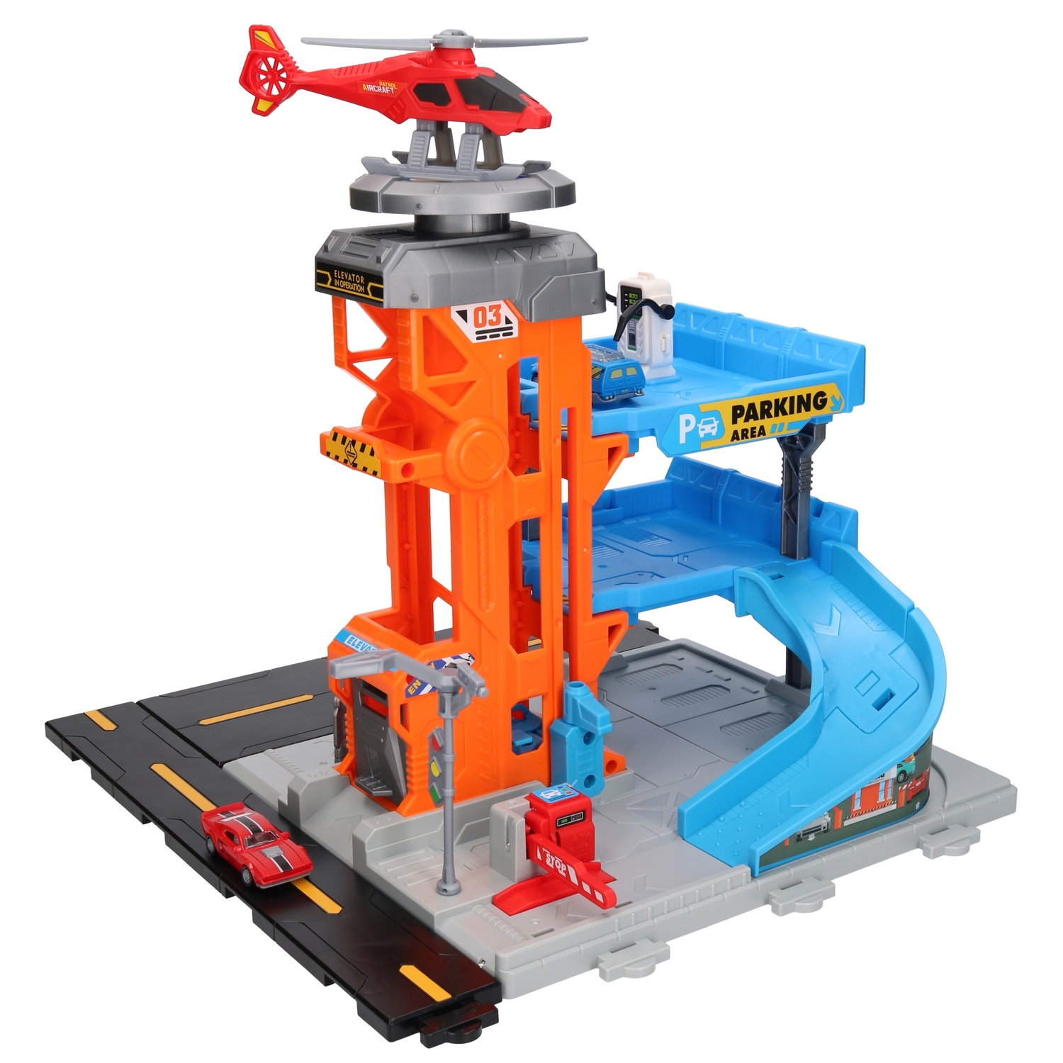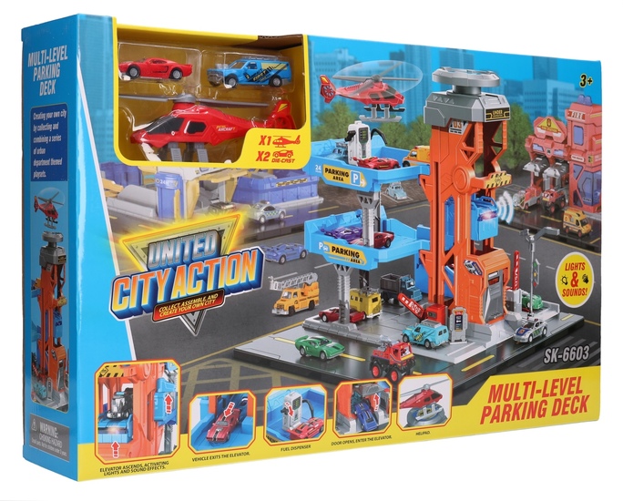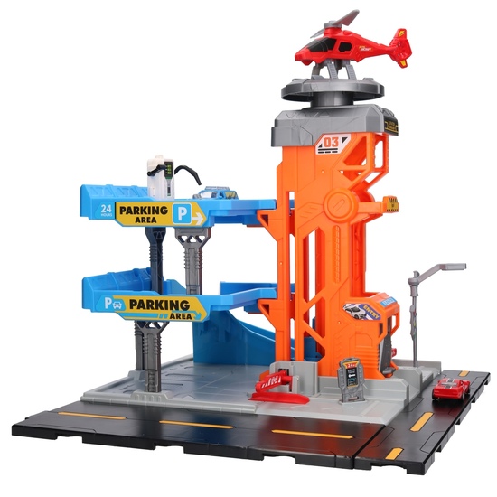 Wielopoziomowy parking posiada wiele elementów ruchomych, co zapewni godziny super zabawy.