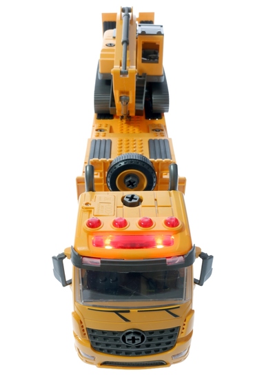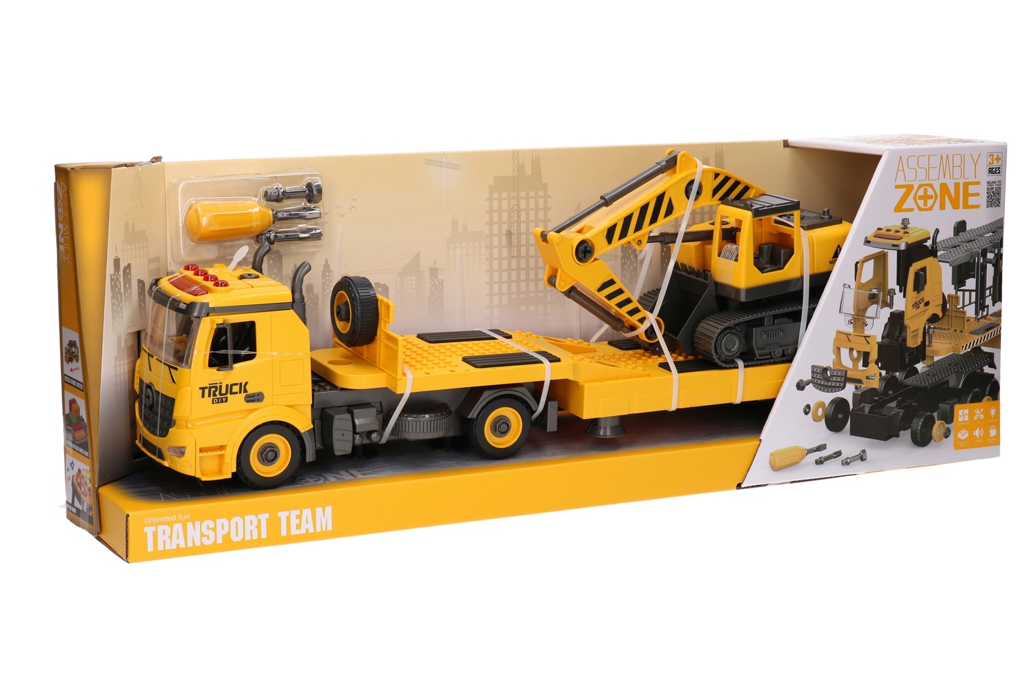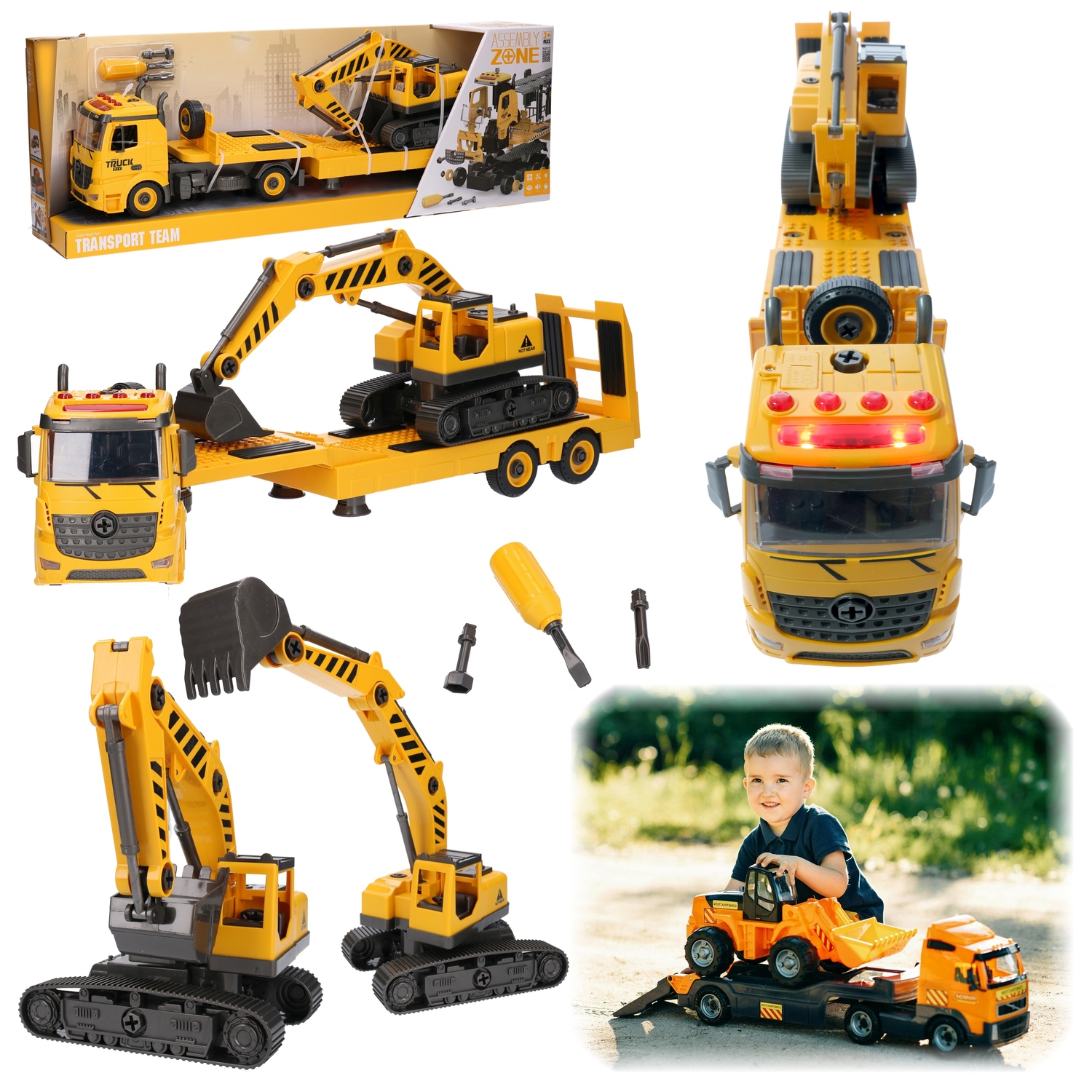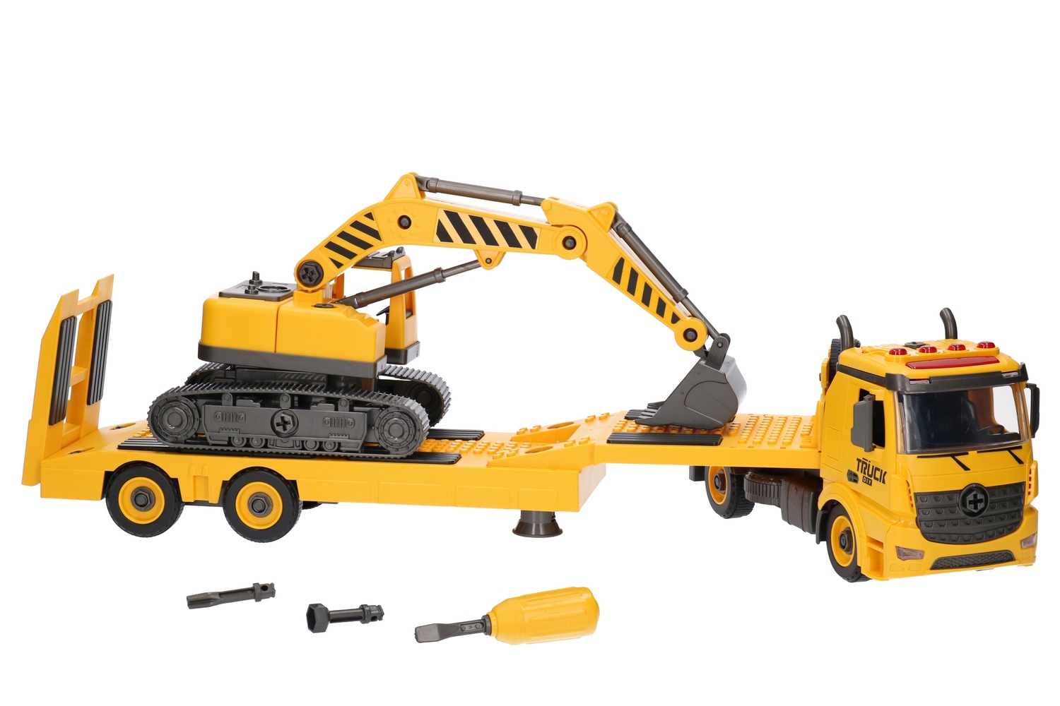 Super zestaw - ciagnik siodłowy wraz z lorą, który można samodzielnie rozłożyć, a właściwie rozkręcić na części pierwsze, po czym z powrotem poskładać elementy i skręcić je załączonym śrubokretem z różnymi końcówkami.